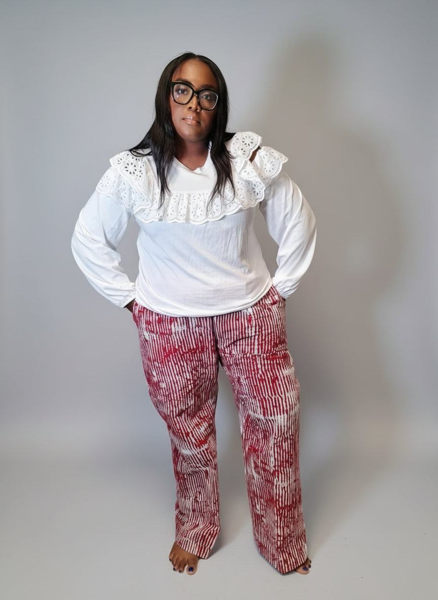 Crafted from luxuriously soft, breathable cotton, this two-piece set features a relaxed fit with a striking batik-inspired print. The black print has a red plain cotton aso-oke band, the red has a black a red band. The top’s easy V-neckline and short sleeves pair perfectly with tapered pants that include a comfortable elastic waist and adjustable drawstring tie for the perfect fit. The sizes are generous.